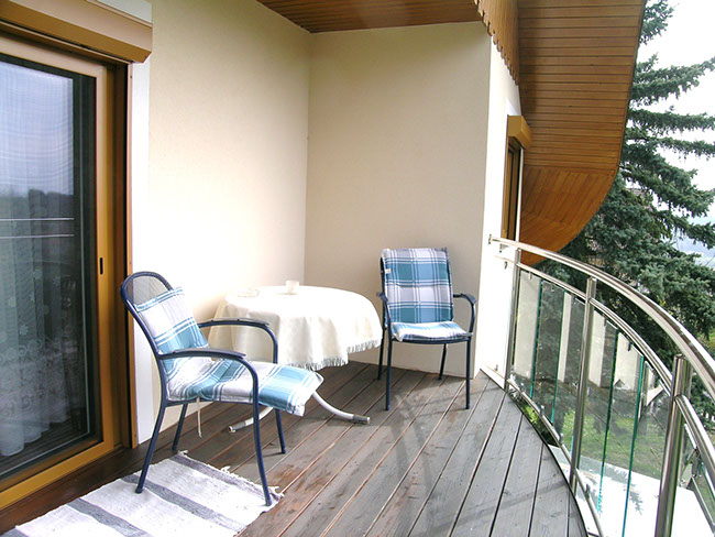 mit großem Balkon (10m²) und einer ausziehbaren Couch, Schlafzimmer getrennt; Klimaanlage
